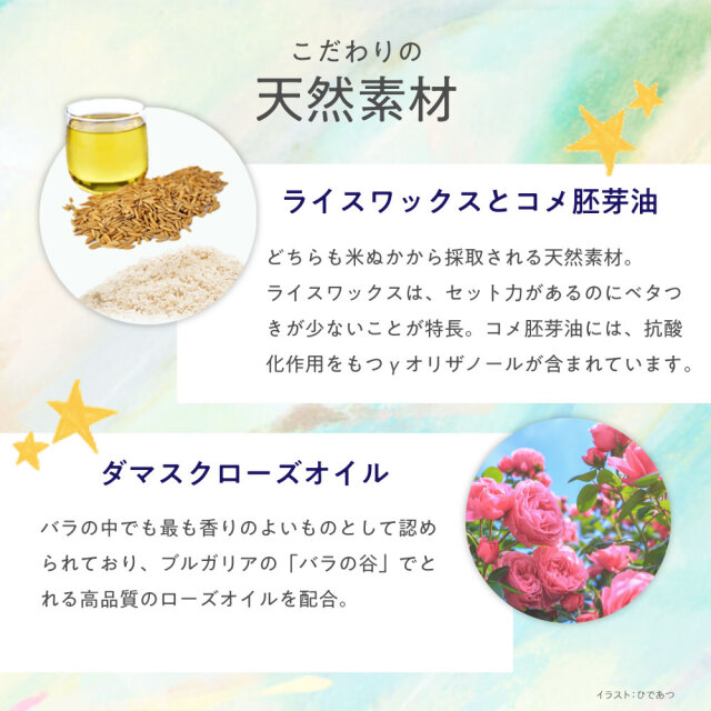 ぬくもりのあるパッケージデザイン・香り・天然素材にこだわり、ケア効果とベタつきの少なさで素髪を活かした自然な仕上がりを表現します。