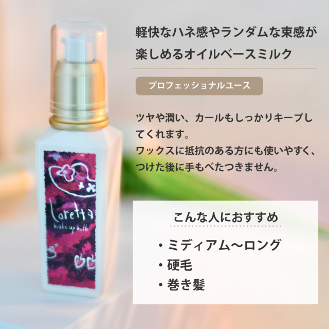 「キープ力が弱い、毛先が乾燥する、キシミを感じる」といった不満を解消したオイルベースのスタイリングミルク。ツヤや潤い、カールもしっかりキープしてくれます。ワックスに抵抗のある方にも使いやすく、つけた後に手もベタつきません。