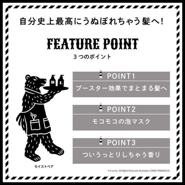 水、ジメチコン、セテアリルアルコール、グリセリン、ベヘントリモニウムクロリド、DPG、パルミチン酸エチルヘキシル、ラウロイルグルタミン酸ジ(フィトステリル/オクチルドデシル)、シクロヘキサン-1,4-ジカルボン酸ビスエトキシジグリコール、加水分解ケラチン(羊毛)、セバシン酸ジエチル、加水分解ヒアルロン酸、ラノリン脂肪酸、ジヒドロキシプロピルアルギニンHCl、センニンコク種子エキス、加水分解コンキオリン、ジアルキル(C12-18)ジモニウムクロリド、ステアリン酸グリセリル、アモジメチコン、コカミドMEA、ステアルトリモニウムクロリド、乳酸、クエン酸、クエン酸Na、イソプロパノール、BG、フェノキシエタノール、香料