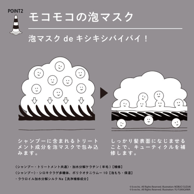 水、オレフィン(C14-16)スルホン酸Na、コカミドプロピルベタイン、PEG-8、ココイルサルコシンNa、コカミドメチルMEA、加水分解ケラチン(羊毛)、ラウロイルグルタミン酸ジ(フィトステリル/オクチルドデシル)、シクロヘキサン-1,4-ジカルボン酸ビスエトキシジグリコール、ラウロイル加水分解シルクNa、シロキクラゲエキス、EDTA-2Na、ポリクオタニウム-10、ポリクオタニウム-47、塩化Na、PEG-40水添ヒマシ油、クエン酸、クエン酸Na、エタノール、安息香酸Na、フェノキシエタノール、香料
